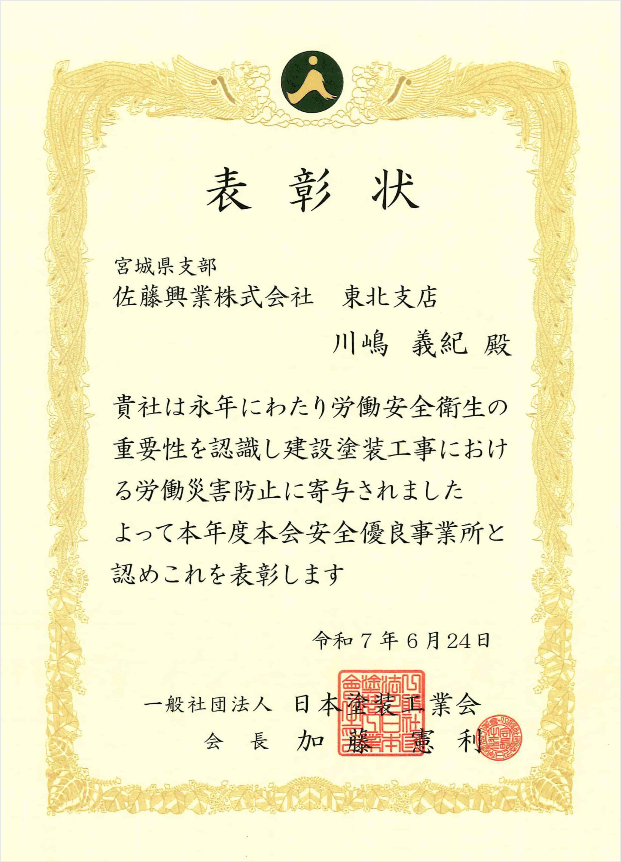 令和7年6月24日、(一社)日本塗装工業会より、当社東北支店が安全優良事業所として表彰されました。