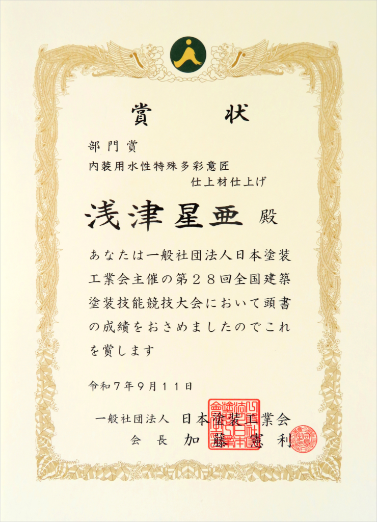 第28回全国建築塗装技能競技大会において、当社社員が「国土交通大臣賞」「部門賞:C課題」の2つを受賞しました
